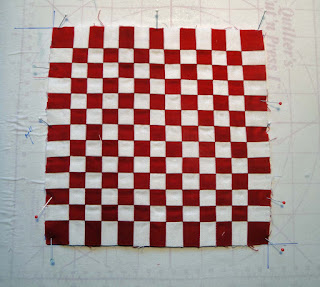 To begin, I once again used Pellon's 1" fusible grid interfacing. I cut 12 by 12 on the squares and then cut out a two inch square from each corner.