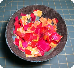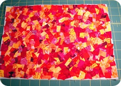 - When you have a pile of little pieces, begin to randomly position them, fusible side facing down, on the lightweight 8 1/2" by 12 1/4" fabric.